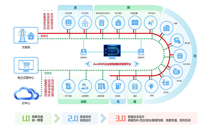 簡介:1.概述 通過在源、網(wǎng)、荷、儲、充的各個關鍵節(jié)點安裝監(jiān)測、分析、保護、治理裝置, 通過高性能邊緣計算網(wǎng)關采集數(shù)據(jù)并上傳至企業(yè)微網(wǎng)平臺。平臺根據(jù)新的電網(wǎng)價格、 用電負荷、電網(wǎng)調(diào)度指令等情況,調(diào)整各系統(tǒng)控制策略并遠程下發(fā),使企業(yè)微電網(wǎng)始終高效穩(wěn)定運行, 降低企業(yè)用電成本,實現(xiàn)能源互聯(lián)、信息互動。 2.應用場所 適用于各行業(yè)企業(yè)內(nèi)部微電網(wǎng)管理系統(tǒng)的新建、擴建、改建等項目。 3.平臺結(jié)構 3.平臺功能 安科瑞AcrelEMS企業(yè)微電網(wǎng)能效管理平臺融合了電力監(jiān)控、電氣安全、照明控制、能源管控、充電樁運營管理、分布式光伏監(jiān)測、儲能管理、設備臺賬、運維管理等功能,通過一個平臺、一個APP整體的對企業(yè)用電進行集中監(jiān)控、統(tǒng)一調(diào)度、統(tǒng)一運維,并且根據(jù)當?shù)毓╇姴块T錯峰避峰計劃提前為企業(yè)制定錯峰避峰方案和預警,滿足企業(yè)